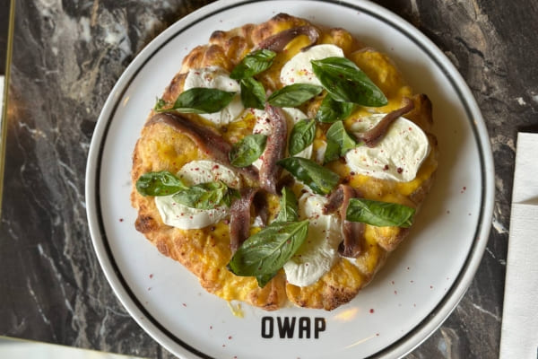 Fiordilatte, stracciatella at the end, anchovies from the Cantabrian Sea, basil pesto, tomato paste, lemon zest, olive oil, basil