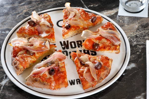 Double-cooked Montanara base, cherry tomato sauce, Parmigiano Reggiano, black olives, smoked Colonnata lard served at the table